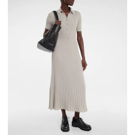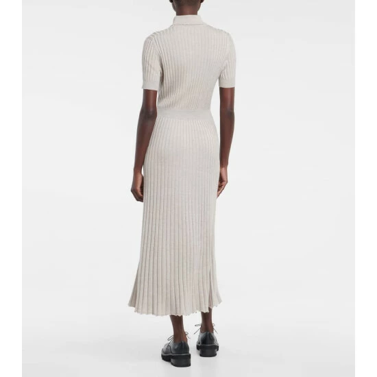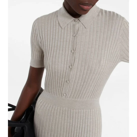 The Amor midi dress from Gabriela Hearst is ribbed-knit from a luxurious silk and cashmere blend. The short-sleeve style has a polo collar, button closures on the bodice, and a body-hugging fit.