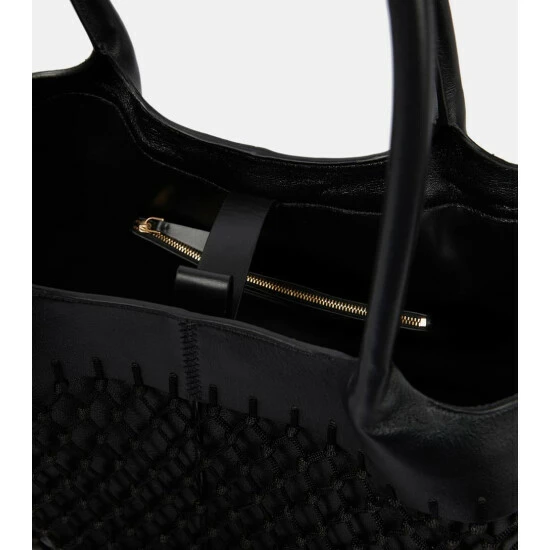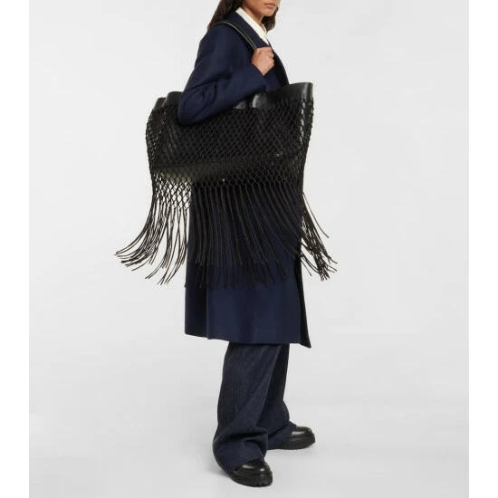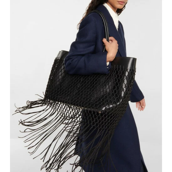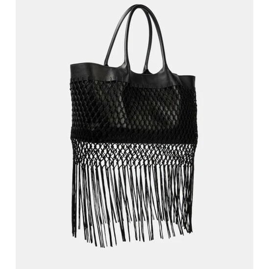 Gabriela Hearst updates the everyday Mcewan tote with a tonal fishnet overlay that adds texture to the classic, structured silhouette. Made in Italy from supple black leather, this voluminous design has long fringes that will sway at every movement, bringing levity to your casual outfits.