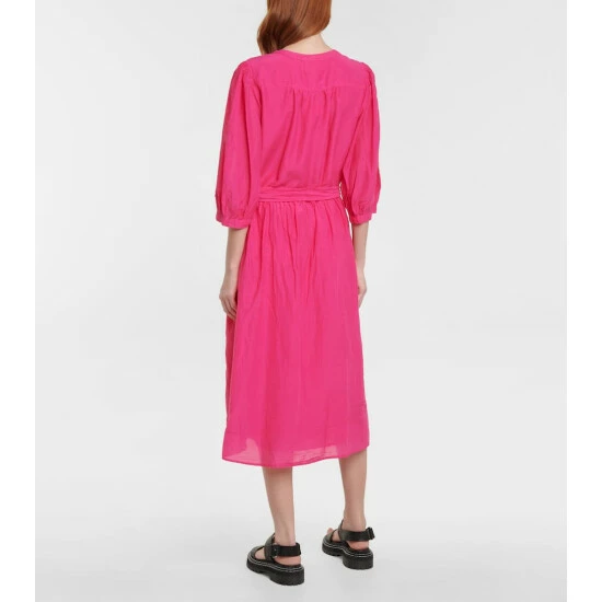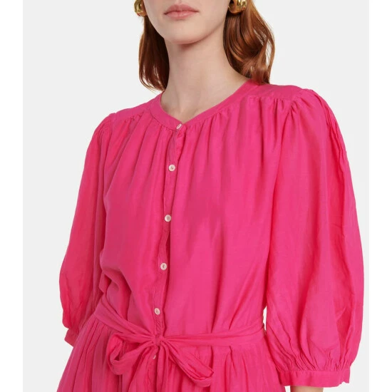 Pink is the color of choice this season with pieces like the Emerson midi dress from Velvet. The blouse-inspired style has voluminous sleeves, frilled cuffs, a self-tie belt, and button-down front.
