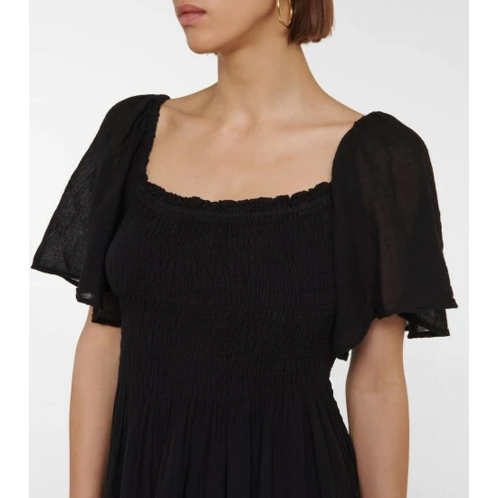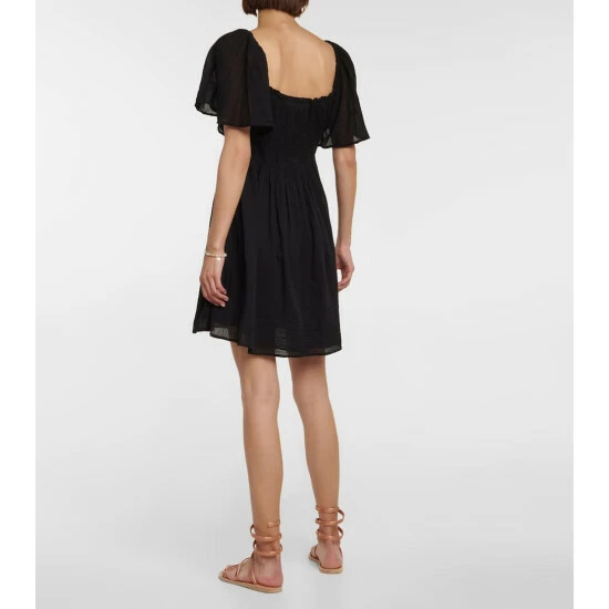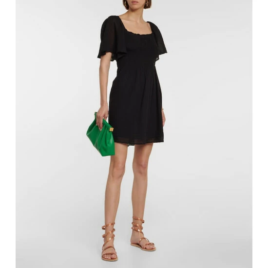Take the Esme minidress from Velvet on your next getaway. It’s made from lightweight cotton gauze with a flatteringly smocked bodice, fluted sleeves, and an elegant flared skirt.