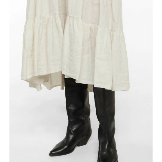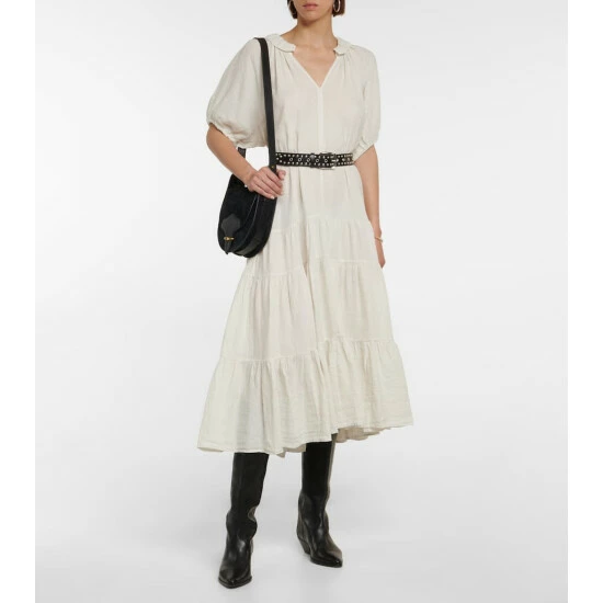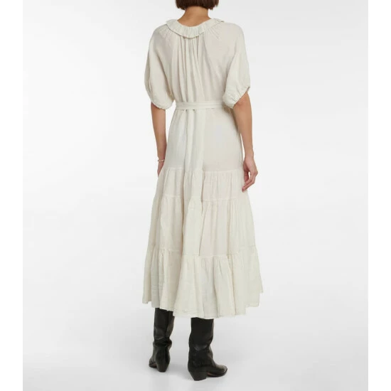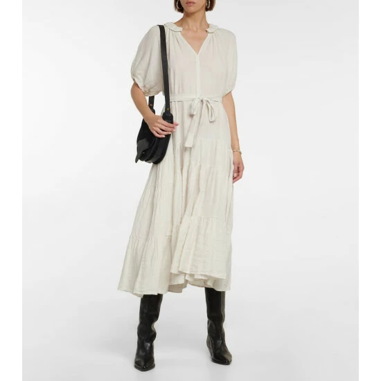The Karina dress from Velvet adds classic detailing to a contemporary design. Finished with a flattering belted waist, the flowing linen dress has a tiered seam skirt and a ruffled collar descending to a deep V-neck.